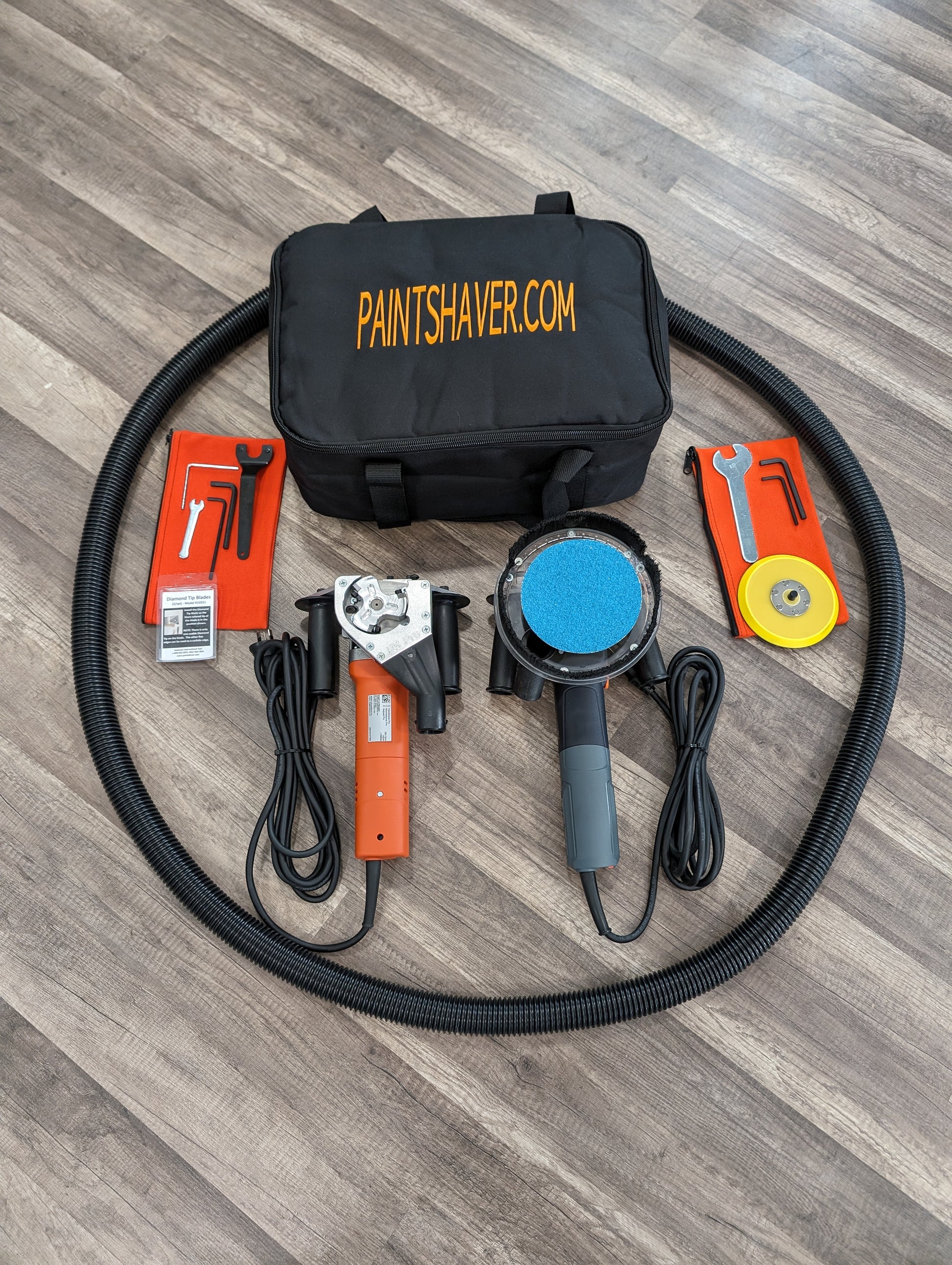 Includes: 240 Volt MarineShaver Pro with Diamond Blades, 240 Volt 5" Random Orbital SanderVac Pro, Nylon tool bags, 10 feet of vacuum hose, a replacement Orbital Backer Pad, adjusting tools, instructions. (vacuum sold separately)